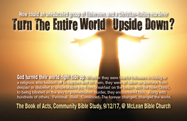 I don’t know about you, but I choose to feed my faith. The 23rd Psalm says that the Lord prepares a table for me, even in the presence of my enemies. So I invite you to come dine with me on God’s word, and subsequently turn our backs on the enemies of fear, discouragement, worry, anxiety and a host of other hostile invaders. McLean Women’s Community Bible Study begins delving into The Book of Acts on Tuesday, September 12th – 9:25 to 11:25. It only takes two hours Tuesday morning to feed our faith within a small group followed by a stellar lecture, then less than a few hours “dining solo,” digging into the next lesson on our own.
