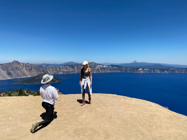 We love that Will and Elizabeth got engaged at Crater Lake, Oregon in July! (I especially loved the look of shock on E’s face when Will took her by surprise!)